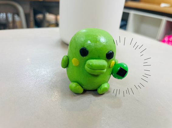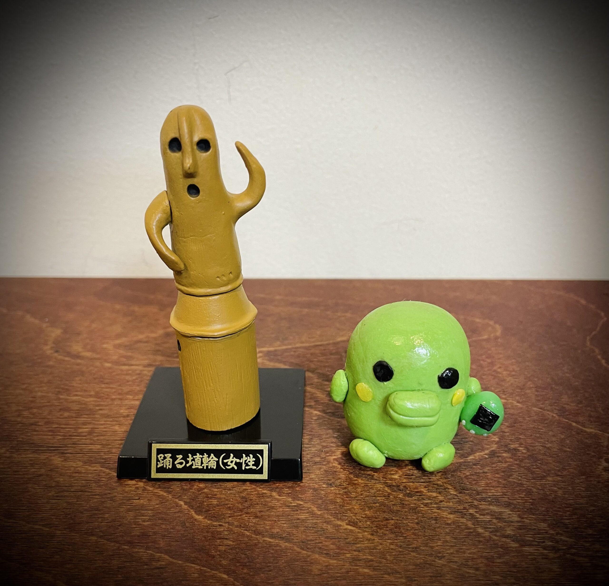 粘土作品 活動 2026.01.12 先日のあのキャラクター、手に何か持ってる・・・!! 今日は午後から「生駒ふるさとミュージアム」に出かけました。 お正月ならではの書初めやコマ回しなどのイベントに参加してきました。 ふるさとミュージアム内にあったガチャガチャで当てた埴輪と一緒にパチリ。